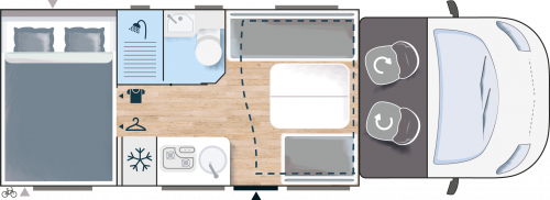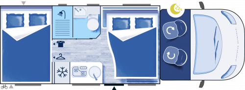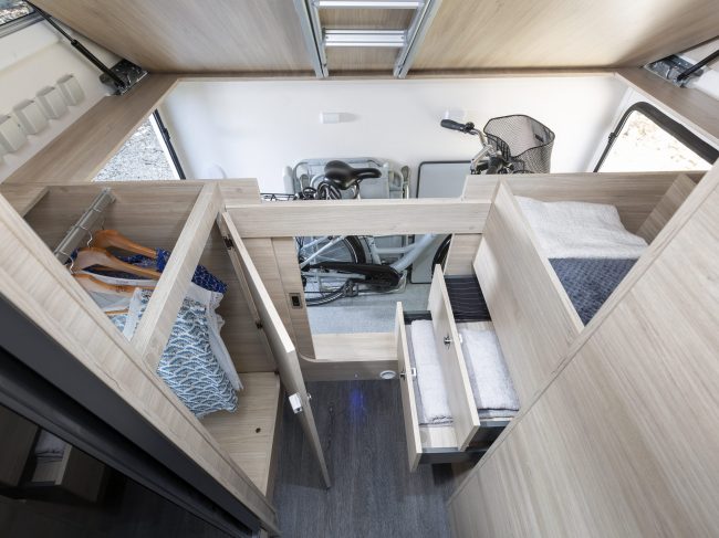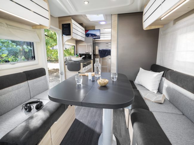 Jeśli chodzi o niskoprofilowe kampery z ładownią garażową poniżej, to 644 wyróżnia się wspaniałym „Smartlounge”, który standardowo mieści 5 pasażerów. Z tyłu łóżko jest podniesione, aby odsłonić schowek na ubrania lub pościel.
