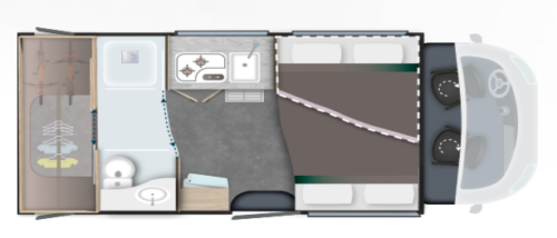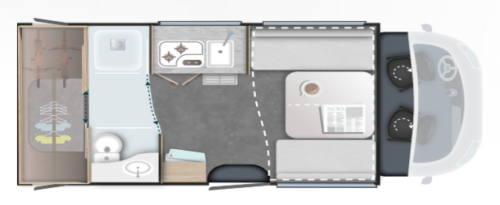 Dużo miejsca do przechowywania i bardzo kompaktowy: oto kamper 650 Low Profile! Z tyłu znajduje się pojemna szafa, schowek na rowery i poprzeczna łazienka; z przodu SmartLounge i chowane łóżko dla dwóch osób. Warto zwrócić uwagę, że przejście przez drzwi wejściowe ma 60 cm szerokości.