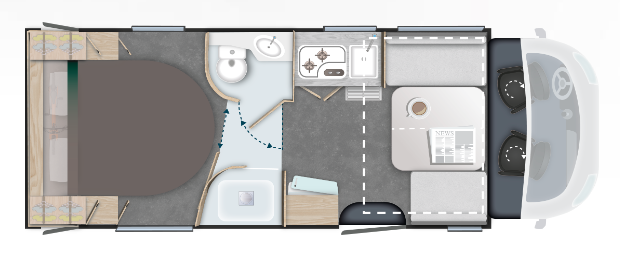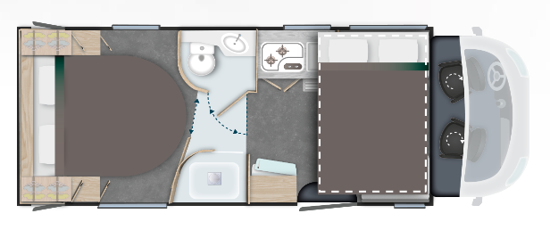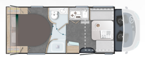 Od momentu wejścia zakochasz się w najnowszej generacji SMARTLOUNGE, który z łatwością przekształca się w dwa wygodne, oddzielne fotele dla pasażerów w podróży. Spodoba Ci się również łazienka (kolejna funkcja najnowszej generacji) z podwójnymi ściankami działowymi, zapewniającymi więcej miejsca i łatwiejszy dostęp. Z pewnością pokochasz również sypialnię z łóżkiem wyspowym o szerokości 260 centymetrów, którego wysokość można regulować, aby dostosować przestrzeń garażu.