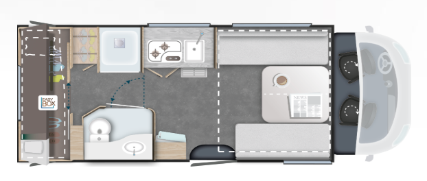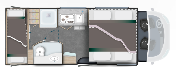 Ten niskoprofilowy kamper z dużym salonem i kanapami ustawionymi ,,twarzą w twarz” oraz pięcioma siedzeniami pasażerskimi stwarza ciepłe i przyjazne otoczenie. Wyposażony w wiele innowacji, zapewnia łatwe rozmieszczenie pięciu osób! Ten nowy układ daje gwarancję komfortu zarówno w wersji dziennej, jak i nocnej.
