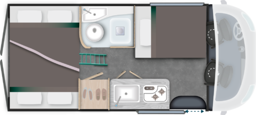 Jaki jest sekret sukcesu V594max? Jego modułowa przestrzeń do spania! Ten wyposażony van, o długości niecałych sześciu metrów, oferuje cztery stałe miejsca do spania. Chausson idzie o krok dalej, oferując przenośną przestrzeń do spania: Czy podróżujecie tylko we dwoje czy w trzy osoby? Zdejmijcie całe lub część górnego, podwójnego łóżka…