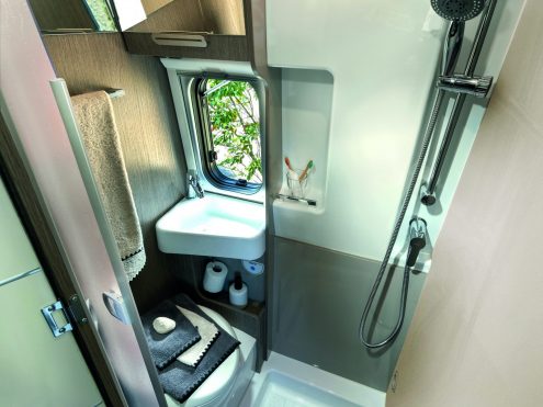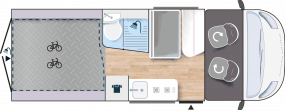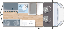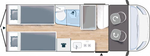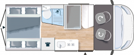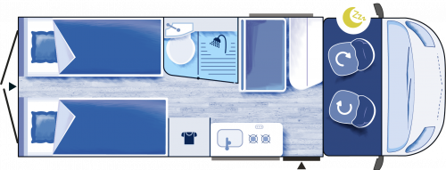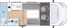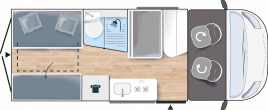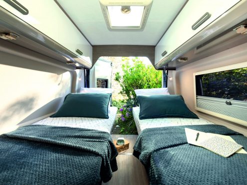 Dzięki V697 Chausson sprostał trudnemu wyzwaniu umieszczenia dwóch ładnych, podwójnych łóżek w kampervanie mierzącym zaledwie 6,36 metra. Pokochasz jego sprytne schowki, w tym podwójną podłogę pod łóżkiem do przechowywania stołu kempingowego i krzeseł. Idealny dla pary, która chce podróżować wszędzie bardzo wygodnym pojazdem.